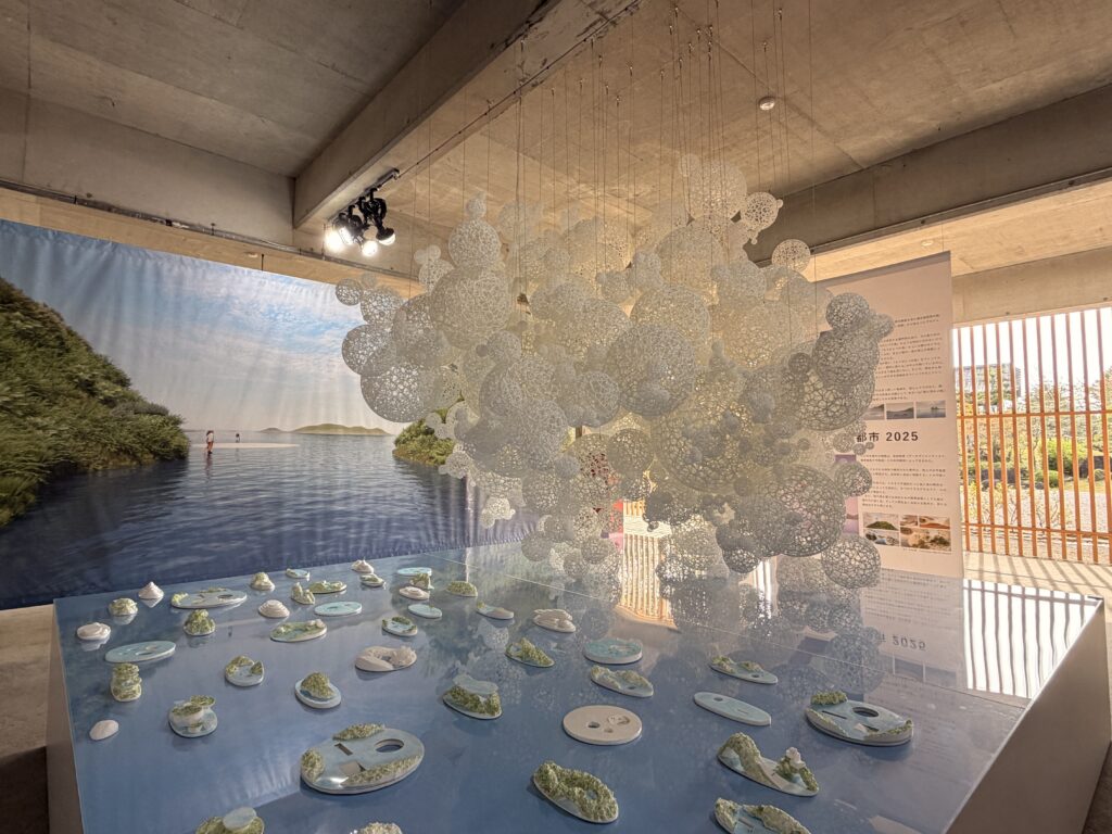 瀬戸内海から着想を得て人・時間・自然を結びつける「場」の創造を軸に、未来の都市を描いた模型が展示されていました。